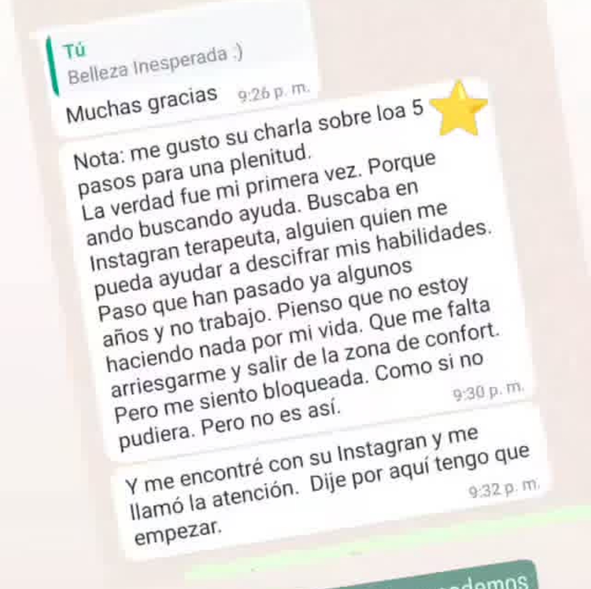 He acompañado a cientos de personas, especialmente mujeres en procesos de transformación personal, a tomar decisiones retadoras y a fortalecer la confianza y autoestima perdida en relaciones difíciles (familiares, sentimentales y laborales).